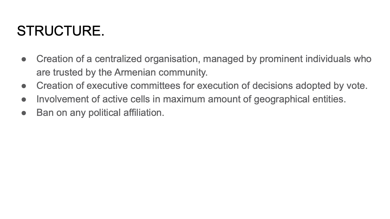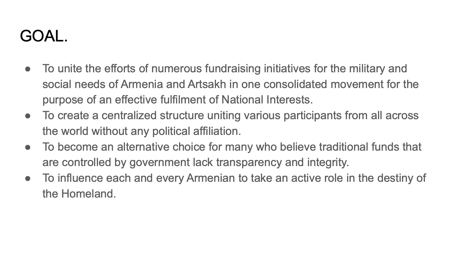 We aim to empower next generation of Armenians into creating a strong and united nation, capable of defending its interests across the planet. We aim to become the structural backbone on which we can build sustainable initiatives for Armenia and Diaspora.
